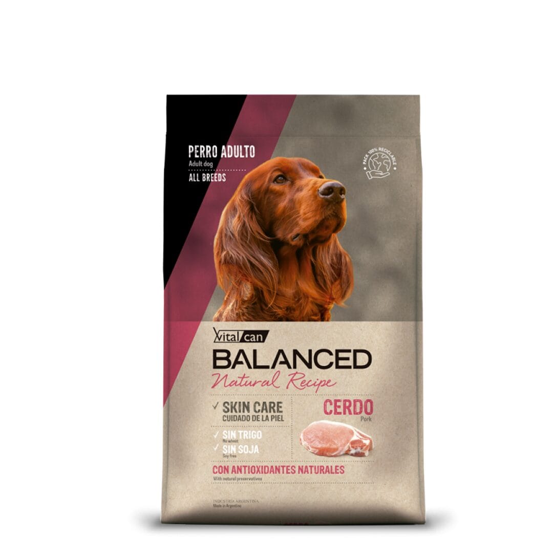 BALANCED DOG ADULTO RECETA CERDO 15+3 KG es un alimento balanceado premium para perros adultos, ideal para aquellos con sensibilidad digestiva o cutánea. Su fórmula monoproteica a base de cerdo ayuda a reducir las reacciones alérgicas frente a otras fuentes de proteína, brindando una opción nutritiva, segura y altamente digestible.