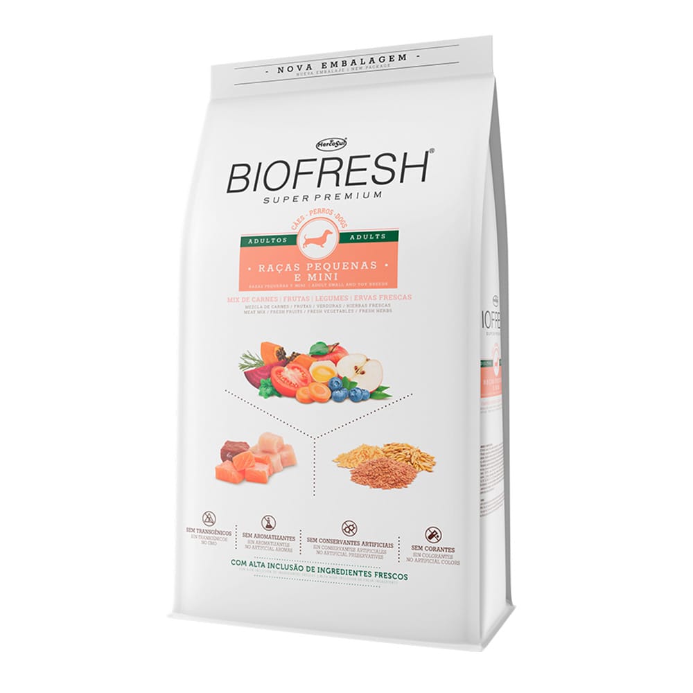Biofresh Adultos Razas Pequeñas y Mini 15kg es un alimento Super Premium para perro especialmente formulado para perros adultos de tamaño pequeño y mini. Su exclusiva receta se elabora con una alta inclusión de ingredientes realmente frescos, como carnes seleccionadas, frutas, verduras y hierbas naturales, lo que garantiza una nutrición completa, equilibrada y de la más alta calidad.