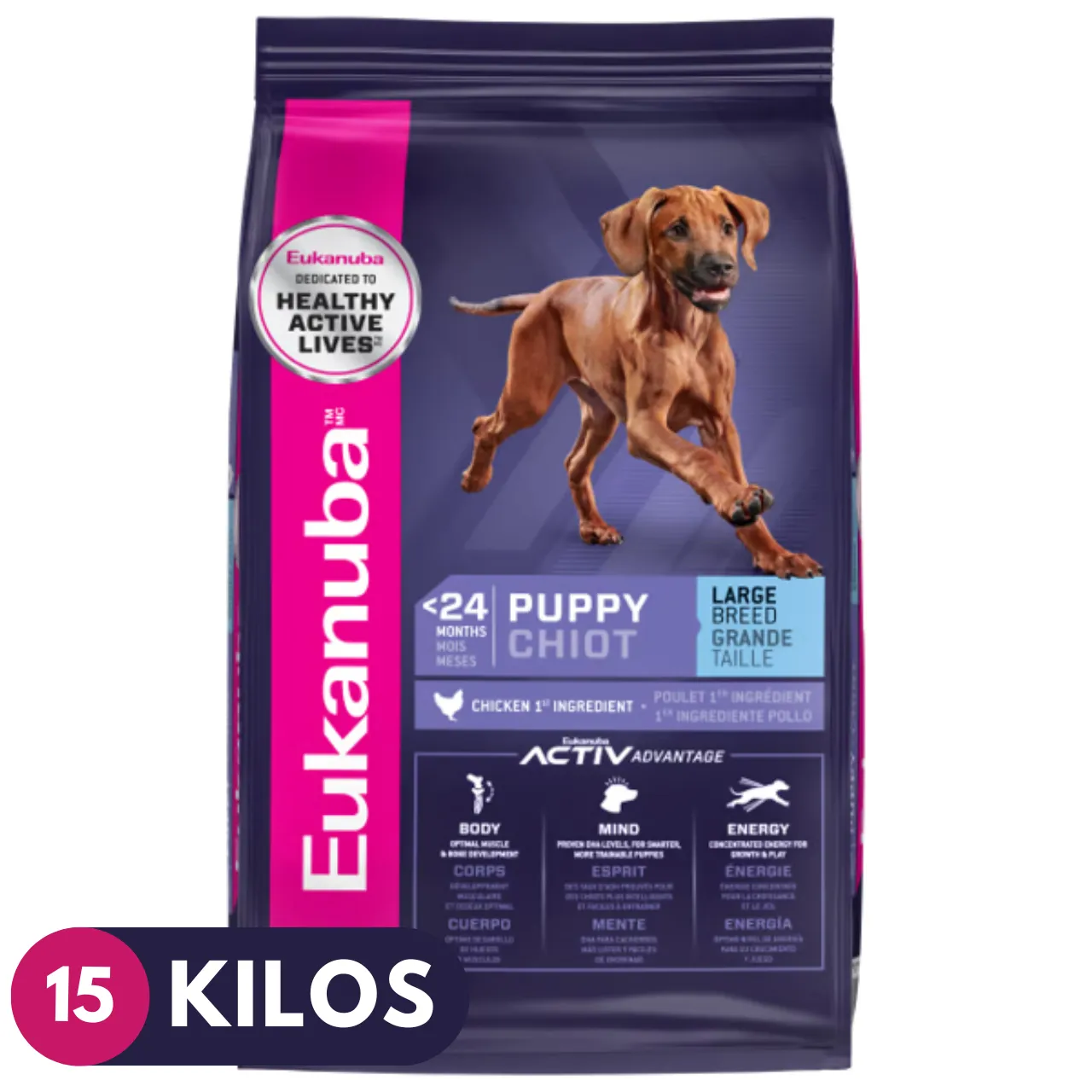 Eukanuba Puppy Large Breed es un alimento balanceado completo para cachorros entre 1 y 12 meses de edad en el caso de razas grandes, o hasta los 24 meses en el caso de razas gigantes. Cachorros de: Labrador Retriever, Ovejero Alemán, Golden Retriever, Boyero de Berna, Cane Corso, Dogo de Burdeos, Bullmastiff y otras razas o perros mestizos que en su etapa adulta pesan más de 25 kg. Las fórmulas para cachorro de Eukanuba, contienen niveles científicamente comprobados de DHA ara apoyar el óptimo desarrollo neurológico del cachorro y maximizar su capacidad de aprendizaje durante el entrenamiento. Contribuye a una óptima digestión, desarrollo y mantenimiento de músculos magros, articulaciones y huesos fuertes.
