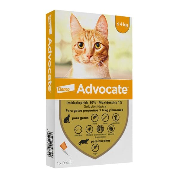 Advocate 0,4 Ml Gatos Pequeños De Hasta 4 Kg’ es un antiparasitario indicado para gatos pequeños, de hasta 4 kg de peso. Es eficaz en el tratamiento y prevención de la infestación por pulgas (Ctenocephalides felis), en el tratamiento de infestación por ácaros del oído (Otodectes cynotis) y para el tratamiento de infestaciones con los nemátodos gastrointestinales (Toxocara cati y Ancylostoma tubaeforme) (larva L4, adultos inmaduros y adultos). Puede ser utilizado como parte de la estrategia de tratamiento en la Dermatitis alérgica a la picada de pulga (DAPP).
